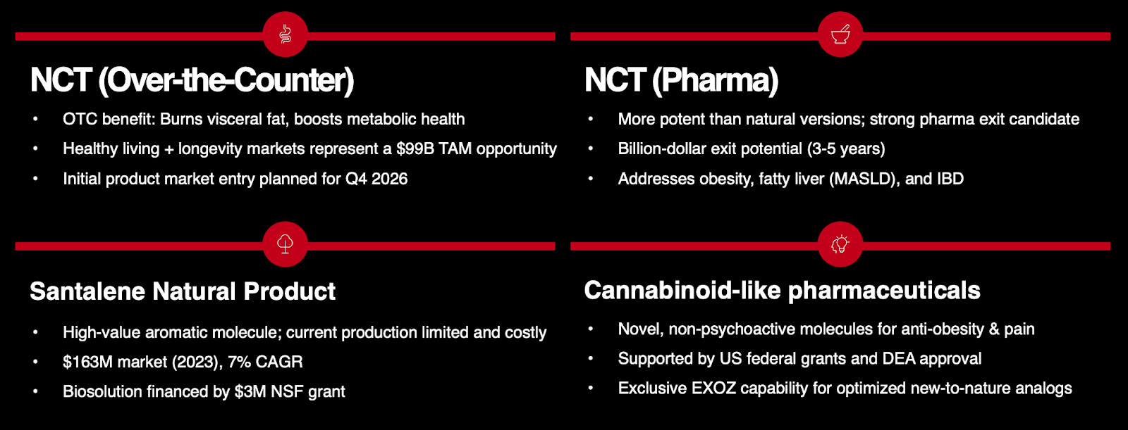 While eXoZymes’ platform has the potential to disrupt hundreds of chemical manufacturing processes, the Q3 investor call reinforced management’s disciplined, capital-efficient near-term strategy. The company is concentrating its efforts on its three core extraordinary business cases: NCT, non-intoxicating cannabinoids and Santalene.