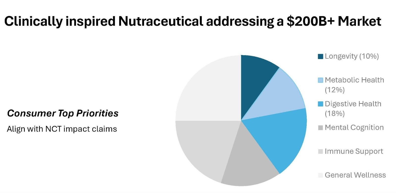 Scientific literature indicates that NCT has genuine efficacy across the three pillars driving current wellness market growth, including longevity support (mitochondrial function), metabolic health (fat burning and energy production) and digestive health (gut barrier integrity). These three pillars together represent a substantial, fast-growing global wellness market worth over US$200+ billion. This positions NCT directly within the highest-demand segments of consumer health.