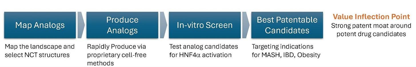eXoZymes’ technical advantage lies in its ability to synthesise new-to-nature compounds from the natural NCT molecule backbone. This allows the company to design analogues with enhanced pharmacological activity, reduced side effects, improved stability and strong composition-of-matter IP. Critically, these candidates could occupy a greenfield space, as there are currently no selective HNF4-alpha agonists that have achieved clinical approval.